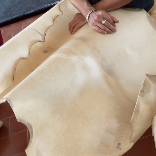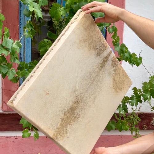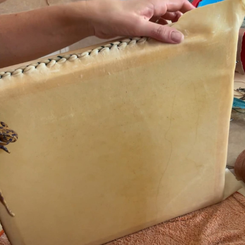 Ao longo de um dia completo, irás acompanhar todas as etapas do processo: desde a preparação das madeiras, à escolha das peles, à costura manual em torno do aro, até à finalização do instrumento.